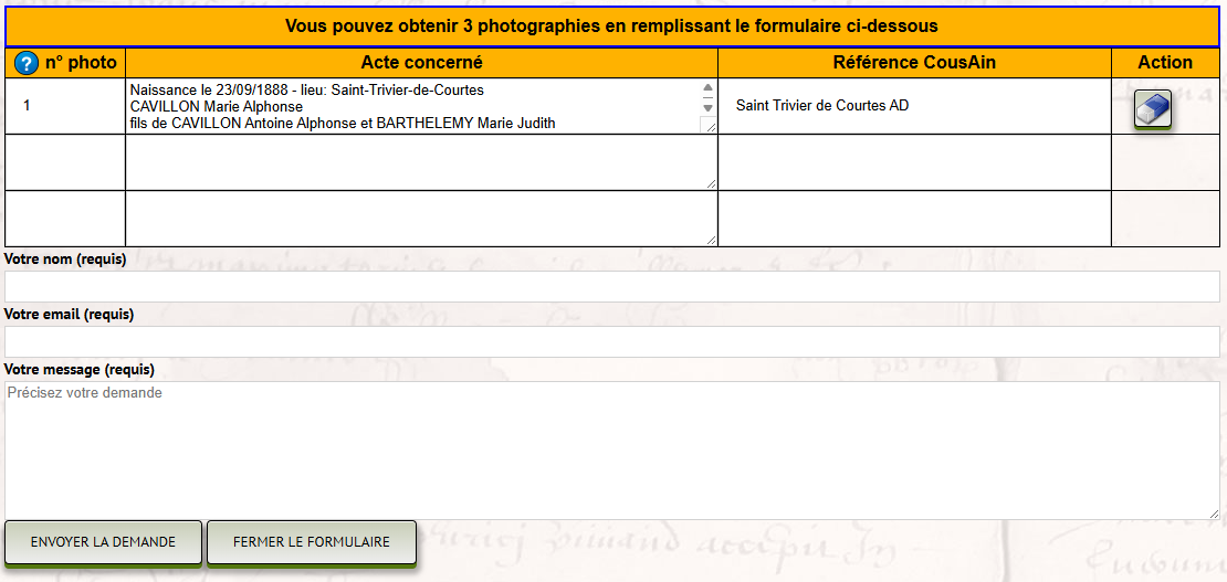 Vous pouvez obtenir 3 photographies en remplissant le formulaire ci-dessous
